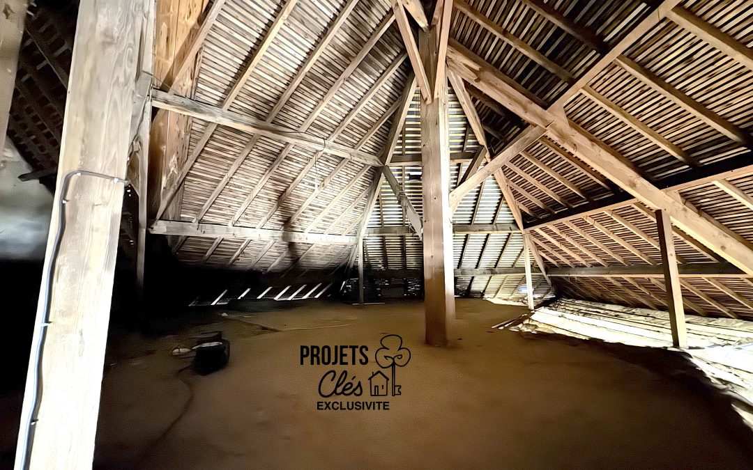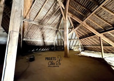 Pour finir, les amoureux des poutres seront ravis de découvrir un grenier aménageable sous rampants, proposant un volume exploitable d’environ 100 m².
